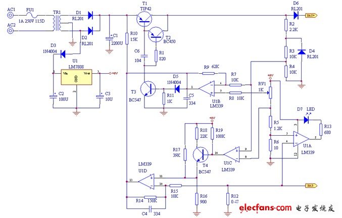 下圖是一款二階段恒流限壓式鉛酸電池充電器的電路圖
