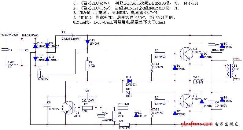 235 ,傳統(tǒng)使用的工頻變壓器因效率低、體積重量大而逐漸減少使用。近年來,電子變壓器以其高效率、小體積等優(yōu)勢已被大量應(yīng)用于低壓石英燈照明場合。本文介紹一種在國內(nèi)應(yīng)用較多、整機性能指標(biāo)較好的電子變壓器電路。一、電路圖