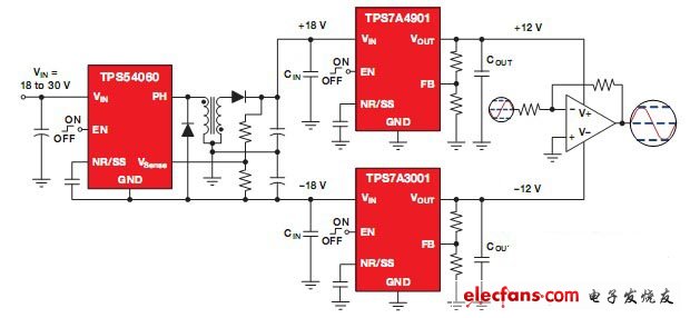 使用一個(gè)如 TPS7A3001 等可調(diào)節(jié)、負(fù)輸出電壓 LDO 線性穩(wěn)壓器,以及如 TPS7A4901 等可調(diào)節(jié)、正輸出電壓 LDO。