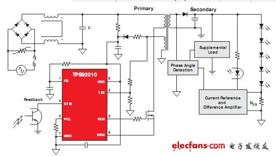 下圖是可調(diào)光LED照明原理圖,如圖所示:TPS92210是一款面向LED照明應用的驅(qū)動器控制器,具有自然交錯功率因素校正(PFC)功能及先進的節(jié)能特性,只在提高效率控制。