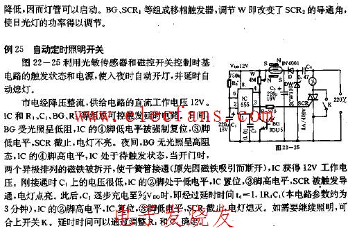 輕觸式定時開關(guān)電路圖:定時開關(guān)由降壓,穩(wěn)壓和整流電路,單穩(wěn)態(tài)電路和可控硅開關(guān)等組成。電網(wǎng)電壓率電容降壓,穩(wěn)壓二極管穩(wěn)壓,二極管整流。