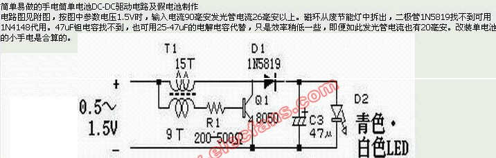 這里描述的電源把電壓從一節(jié)手電筒電池的1.5伏提高到LED所需的3.5伏,同時用電源把LED和手電筒電池串聯(lián)起來。設(shè)計這種電路是為了用LED
