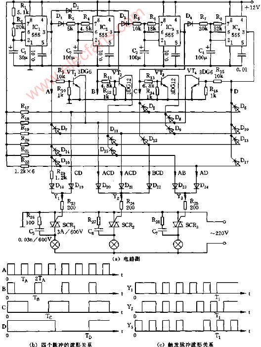 七彩循環(huán)裝飾燈電路圖,此燈具有紅,綠,黃,紫,青,白七種顏色循環(huán)變換,用于舞枯,廣告,酒家,商場等場所,該燈色彩繽紛,產(chǎn)生七彩循環(huán)光