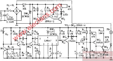 本文介紹的自動調光臺燈能根據(jù)周圍環(huán)境照度強弱自動調整臺燈發(fā)光量。當環(huán)境照度弱,它發(fā)光亮度就增大;環(huán)境照度強,發(fā)光亮度就減暗。 調光臺燈電路及工作原理 該燈電路見圖1。當開關S撥向位置2時,它是一個