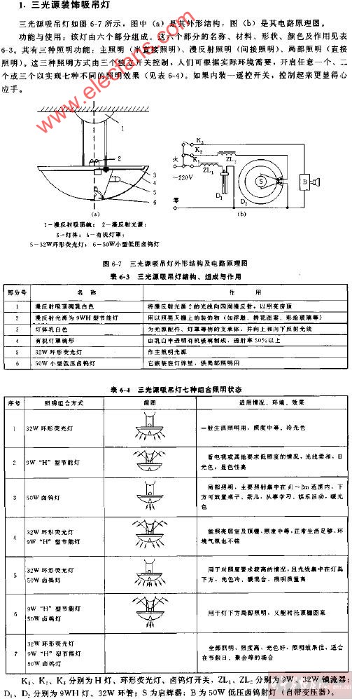 三光源吸吊燈外型結(jié)構(gòu)及電路原理電路圖