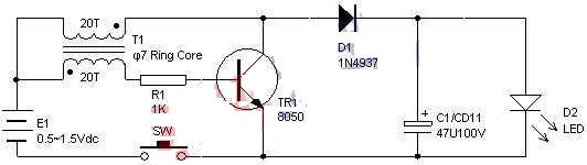 供應(yīng)商送來一些高亮 LED 樣品,一直閑置無用.近日得了一只手電筒,拆開看空間有余,于是決定DIY一把. 電路圖 磁環(huán)選用T9*5*3/2K,也可用T10*6*5等,用0.3mm漆包線雙線并繞20T,按圖中同名端連接