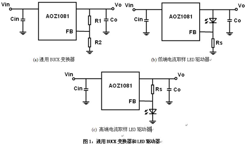 本文將基于AOZ1081來介紹反饋環(huán)的設(shè)計(jì),因此先介紹一下AOZ1081的工作特點(diǎn)。AOZ1081是一款降壓型Buck變換器,工作于電流模式,其特點(diǎn)可以讓它配置成LED驅(qū)動(dòng)器,同時(shí)也可以作為通用Buck變換器使用。其特點(diǎn)如下: