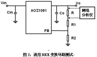 對(duì)于通用BUCK降壓型變換器,可以直接在反饋分壓電阻器上部電阻中,直接串接一個(gè)100歐姆的電阻R,由R注入測試信號(hào),測量增益裕量和相位裕量,用于決定的系統(tǒng)的穩(wěn)定程度,如圖2所示。注意到,相對(duì)于輸出的負(fù)載電阻,此回路相當(dāng)于一個(gè)高阻抗回路,因此不影響系統(tǒng)的正常工作。