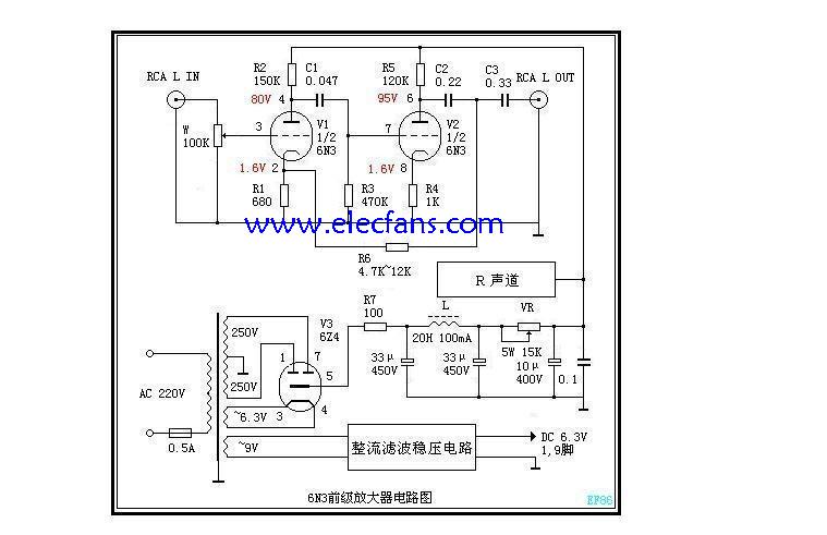 6N1膽前級電路圖 (帶電源供電電路,放大倍數(shù)12倍)