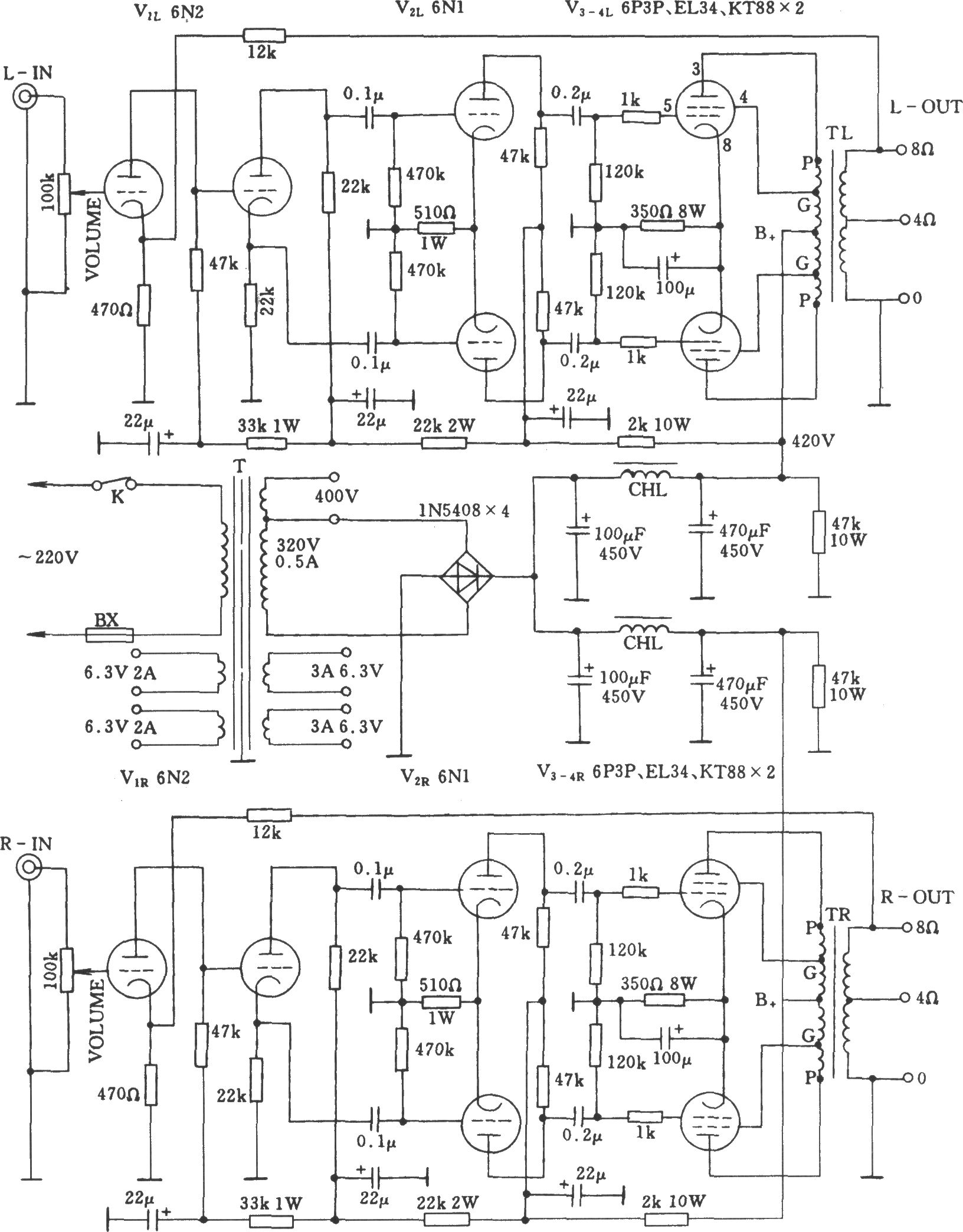 當(dāng)推挽功放管采用KT88、6550、KTl00時,其輸出功率可達(dá)60W+60W;如推挽功放管采用EL34、6CA7時,其輸出功率為40W+40W;女H推挽功放管采用6P3P、6L6時,其輸出功率為30W+30W。
