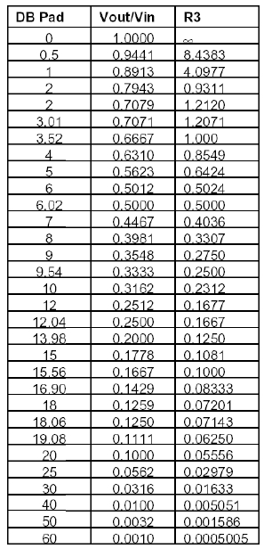 在表一中的一套規(guī)格化的R3 的阻值可以用作產(chǎn)生不同等級的衰減。對于表中沒有的阻值,可以用以下的公式計算
