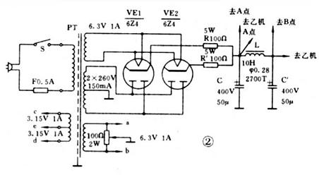 其中電壓放大管可用6N1代替,代替后R4降至100kΩ,R8降為100kΩ,R10降至50kΩ左右。用6N15代替時改動法如上。電源整流電子二極管可用6Z4代換。因單只6Z4管最大直流輸出電流只有75mA,故應(yīng)用兩只管于并聯(lián)后使用,電路改動如圖2。