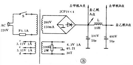 電源部分采用5Z2P進行整流,然后經(jīng)過π型LC濾波電路對機供電。其中燈絲繞組、電壓放大級與功放級宜獨立繞制,以期減少相互干擾。