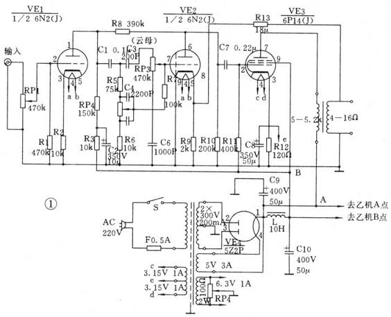 整機電路圖見圖1。每個聲道只需2只管子。放大作用以音調(diào)網(wǎng)絡(luò)為界分為前后二部分。前一部分為電壓放大部分,后一部分為末前級與功放級。VE1、VE2選用高μ管6N2,以提高整機靈敏度。電壓放大級的主要技術(shù)指標(biāo)是放大倍數(shù)和頻率失真程度。6N2放大系數(shù)為97.5,足以滿足本機要求。采用阻容耦合,中頻區(qū)域的放大倍數(shù)最大,幅頻特性和相頻特性都很平坦。而低頻區(qū)域和高頻區(qū)域都以一定的規(guī)律下降。通常要提高上限頻率就要減小R4值,要延伸下限頻率就得增大C1值。經(jīng)反復(fù)調(diào)試,本機電壓放大級屏極負(fù)載電阻取值150k,C1用0.1μF。末前級是典型的具有陰極電阻的自生偏壓兼越級負(fù)反饋的電壓放大器。