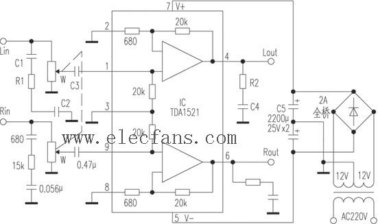 關(guān)鍵字:NE5532,TDA1521,功放電路圖