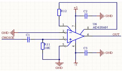 由于正弦信號(hào)發(fā)生器的輸出信號(hào)峰峰值在1V左右,和網(wǎng)絡(luò)負(fù)載串聯(lián)的取樣電阻上的電壓降很小,要對(duì)取樣后的信號(hào)進(jìn)行放大。運(yùn)用兩級(jí)放大,前置放大級(jí)使用AD620。AD620是一種低功耗的儀用放大器,特別適合做小信號(hào)的前置放大級(jí),經(jīng)AD620放大后的小信號(hào)失真度很小,加一級(jí)AD620組成的前置放大,同樣可以把系統(tǒng)誤差控制在系統(tǒng)設(shè)計(jì)要求的范圍內(nèi),前置放大電路如圖2.10。