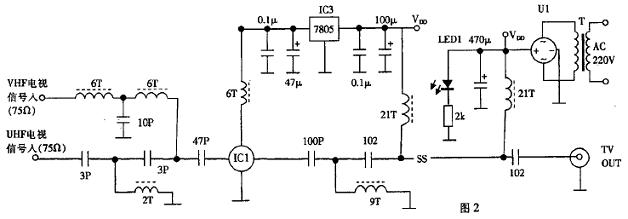 1.放大-混合方式的天線放大器的電路圖如圖1所示。1~12頻道電視信號(hào)在VHF輸入端輸入,由L1、C1、L2組成一個(gè)簡易低通濾波器,濾除12頻道 以后的電視信號(hào),送到IC1信號(hào)輸入端進(jìn)行約20dB的放大,被放大的電視信號(hào)經(jīng)電容C3輸出,通過L3、C4、L4低通濾波器與UHF信號(hào)相混合后輸送 到電視信號(hào)輸出端。另一路UHF輸入端輸入的13~57頻道電視信號(hào),由C5、L5、C6組成簡易高通濾波器,只允許UHF頻段的13頻道及以后頻道的信 號(hào)通過,再加到IC2信號(hào)輸入端進(jìn)行約20dB的放大,輸出后通過高通濾波器(C7、L6、C8)與VHF電視信號(hào)相混合后送TV OUT端。該電路的電源由變壓器T降壓、U1整流、C14濾波、IC3穩(wěn)壓后供給放大器。LED1、R1為電源指示電路。