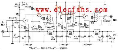 電視天線放大器電路如圖所示。由L1、C1組成輸入回路,起頻率選擇和阻抗匹配的作用。放大器的第一級(jí)采用共射一共基放大電路,這種電路穩(wěn)定性較高,噪聲系數(shù)小。放大器的第二、三級(jí)為共發(fā)射極電路,各級(jí)均有調(diào)諧回路。為使放大器有較寬的通頻帶,調(diào)諧. 電視天線放大器電路圖: