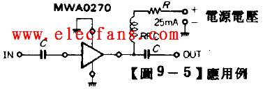 最近,由於使用單石(Monolithic)IC之關(guān)系,要組成簡單的寬頻帶放大器是輕而易舉的,在此就介紹MWA 0204,0211,0270(Motorola)之產(chǎn)品,1GHz以上的頻率各零件的功率增益(Power Gain)有差異的原因(見圖9-1),系封裝(Package)方式不同之故(圖9-2),此IC的特點如下所示:功率增益12dB(@500MHz)。很容易就可以串接(Cascade)。輸入、輸出的阻抗為50Ω。MWA0270的S參數(shù)及各特性如圖9-3及圖9-4所示,謹(jǐn)提供參考,電路如圖9-5所示,必要的零件為偏壓電阻,RFC及直流隔絕用的電容器,此直流隔絕用的電容器數(shù)值決定低頻之響應(yīng),-3dB之頻率點,可以由下列式子算出