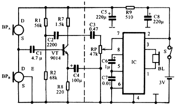 這是電子助聽(tīng)器的電路圖,具有靈敏的聲音檢測(cè)和節(jié)能功能,因此這款助聽(tīng)器可以在 9V 電池循環(huán)下長(zhǎng)期工作。常見(jiàn)的助聽(tīng)器電路一旦開(kāi)啟,就會(huì)持續(xù)消耗電池能量。