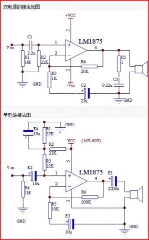 LM1875功率較TDA2030及TDA2009都為大,電壓范圍為16~60V。不失真功率為20W(THD=0.08%),THD=1%時(shí),功率可達(dá)40W(人
