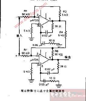 如圖所示為共模電壓可達(dá)±l00V的差動輸入放大電路。在實際應(yīng)用中,有時需要放大器具有高共模輸入電壓(±100V),為了增強這一特性,往往需要犧牲另外一些特性。能夠?qū)崿F(xiàn)共模輸入電壓高±l00V的差動輸入放大器如圖所示。該電路的電壓增益只等于1。電路中使用了兩片通用集成單運放301。