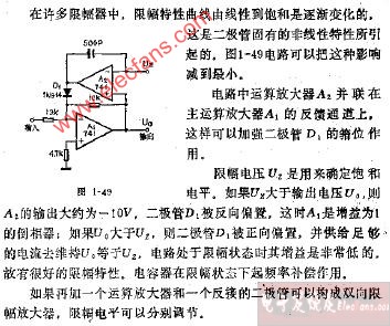 圖中所示是用通用II型F007運放組成的精密限幅放大器線路.在限幅器中,限幅我曲線從線性到飽和是逐漸變化的,圖