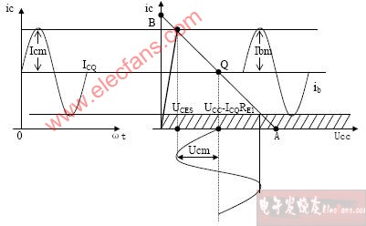 態(tài),如B 點所示,集電極電壓雖然較大,但集電極電流波形有凹陷,因此輸出功率