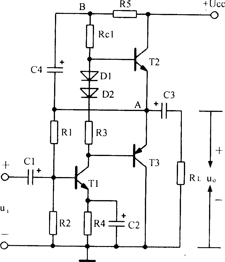 OCL準(zhǔn)互補功率放大電路圖 電路結(jié)構(gòu):T1、T2為差放輸入級,T4為共射放大級和T7~T9、T8~T10組成準(zhǔn)互補功率輸出級。 靜態(tài)電流:R1和D1、D2先確定了基準(zhǔn)電壓并與T3、T5組成恒流源。T3提供