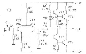 ????????由VT1、 VT2組成差動放大電路,每管靜態(tài)電流約為0.5mA。R3為VT1的集電極負載電阻,VT1與推動級VT4之間為直接耦合。輸出級由兩只型號相同的 NPN型大功率晶體管VT5、VT6組成,而沒有采用互補對稱推挽電路。輸出管VT6對于負載(揚聲器)來說是共發(fā)射極電路,而VT5則是射極輸出電路,因此是不對稱放大。但實驗測試表明,整個放大電路在取消大環(huán)負反饋(將R5短路)時的開環(huán)失真卻很小,而且主要是偶次諧波失真。這個功勞應該歸功于推動級電路。推動電路是本機最具特色的電路,它的作用和效果與傳統(tǒng)的RC自舉電路相比,有過之而無不及。VT4為集-射分割式倒相電路,分別由其集電極和發(fā)射極輸出一對大小相等、方向相反的信號。VT4對于輸出管VT6來說為射極輸出電路,電壓放大倍數(shù)小于1。從VT4集電極輸出的信號通過交流電阻很小的發(fā)光二極管VD1,加到輸出推動管VT3的基極。VD1的正向?qū)▔航导s為1.9V左右,可看作一個噪聲很小的穩(wěn)壓二極管,它使得VT3的發(fā)射極電阻R7兩端的直流電壓UEC基本不變,約比VD1的穩(wěn)壓值小0.7V。對交流信號而言,R7是與VT3的發(fā)射結(jié)電阻相并聯(lián)的。VT3和VT5組成同極性達林頓式復合管。因此推挽放大的上臂是由一級共射放大電路(VT4)和二級射極輸出電路(VT3、VT5)構(gòu)成的,而推挽電路的下臂是則由一級射極輸出電路(VT4)和一級共射放大電路(VT6)構(gòu)成,可見是不對稱的推挽放大電路。故在選擇放大管時,這幾只管子的電流放大系數(shù)也不必配對。這一點在工廠大批量生產(chǎn)時尤為重要,可以大大降低成本。該樣機各管β值如下:β1=β2=110, β3=50,β4=90,β5=70,β6=90。也就是說,要把β值較大的管子優(yōu)先安排為VT4和VT6。該功放電路的開環(huán)電壓放大倍數(shù)約為504,閉環(huán)電壓放大倍數(shù)由R4和R5決定,約為15.7。甲類推挽功率放大電路的理論最高效率為50%,該樣機實測最大不失真輸出電壓的有效值為11V,折合成輸出功率約為15W(8Ω),靜態(tài)功耗約為40W,因此最高效率為37.5%。當無信號輸入時,效率為零,40W功率幾乎全部消耗于兩只輸出管上,因此要加上足夠面積的散熱器,并且保證通風情況良好。