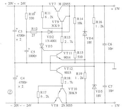 該電源的輸出電壓基本上由VD4、VD5兩只穩(wěn)壓管的穩(wěn)壓值決定,約比它們的穩(wěn)壓值低0.7V左右(即減去VT11、VT12的發(fā)射結(jié)直流壓降),故對兩只穩(wěn)壓管要仔細挑選配對。