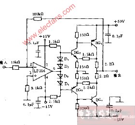 功率MOSFET管構(gòu)成的高電壓、高轉(zhuǎn)換速率的功率放大器電路圖