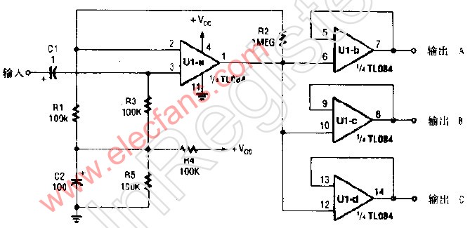 描述AD4-4是一個低噪聲、低失真音頻分配放大器,能被靈活的連接成多種輸入輸出組合。在各信號輸出中提供極好隔離,任何一個通道有信號不會影響其他通道。