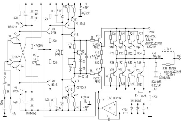 電子愛好者在自制30瓦以上的音頻功率放大器時總是設(shè)法采用集成功放電路,這樣的確會使制作工藝簡化,但卻使得制作者不易領(lǐng)會電路原理,因而分立元件的功率放大器仍有存在的必