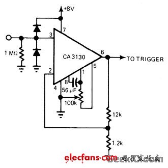 電路提供頻率響應(yīng),頻率為0至1MHz,功率水平較低。用以驅(qū)動(dòng)頻率計(jì)數(shù)器CMOS邏輯。二極管保護(hù)過(guò)載輸入。頻率源的輸出阻抗應(yīng)保持在50K以下,以降低噪音探測(cè)。