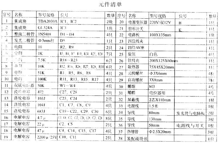 TDA2030型立體聲功率放大器是以集成電路TDA2030a為主組成的立體聲功率放大器,其采用典型的功率放大電路,具有失真小、外圍元件少、穩(wěn)定性高、頻響范圍寬、保真度高、功率大等優(yōu)點,同時采用四運放GL 3 2 4 a對輸入音頻信號進行處理及高、低音進行控制,從而更加保證輸出聲音的音質(zhì)。這是一款很適合無線電愛好者和音響發(fā)燒友自制的音響套材。本功率放大器實際聆聽,高音柔美細(xì)膩,低音豐滿圓潤。