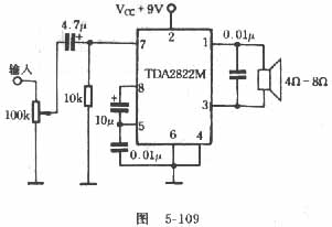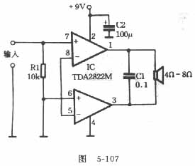 本文介紹的功放電路簡(jiǎn)單,自制方便。電路如圖5-107所示。用一塊TDA2822M功放集成電路接成BTL方式,外圍元件只有一只電阻和兩只電容,不用裝散熱器,放音效果也令人滿意的。