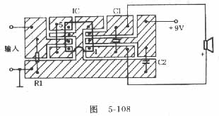 ??? 集成電路TDA2822M為8腳雙列直插式封裝,如果買不到可用TDA2822代替,TDA2822的封裝與TDA2822M相同,它們區(qū)別在于:TDA2822M從3V到15V均可工作,而TDA2822的最高工作電壓只有8V。使用TDA2822必須把電壓降到8V以下。R1的數(shù)值要求不拘,一般選用10k的碳膜電阻。C1可選用0.1uF的滌綸電容,C2為100uF/160V的電解電容。 圖5-108是其印制電路板圖。由于電路簡(jiǎn)單,印制板可用鏟刻法制作用水磨砂紙或牛皮紙沾少量水擦亮,用水洗凈擦干,涂上一層松香酒精溶液,干后把元件直接焊在銅箔面即可。 焊好后檢查無(wú)誤,然后先不接揚(yáng)聲器,接上電源,則正負(fù)輸出端之間電壓應(yīng)小于0.1V。接上揚(yáng)聲器,用手觸摸輸入端,揚(yáng)聲器應(yīng)發(fā)出較大的“嗡”聲。這時(shí)即可輸入信號(hào)試音。電路板不用鉆孔。