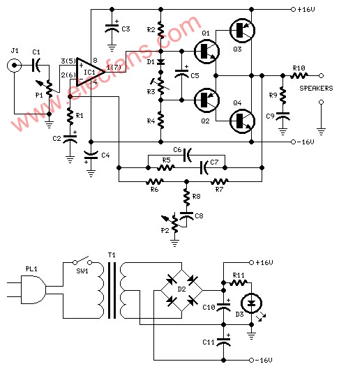 This design is based on the 18 Watt Audio Amplifier, and was developed mainly to satisfy the requests of correspondents unable to locate the TLE2141C chip. It uses the widespread NE5532 Dual IC but, obviously, its power output will be comprised in the 9.5 - 11.5W range, as the supply rails cannot exceed ±18V.