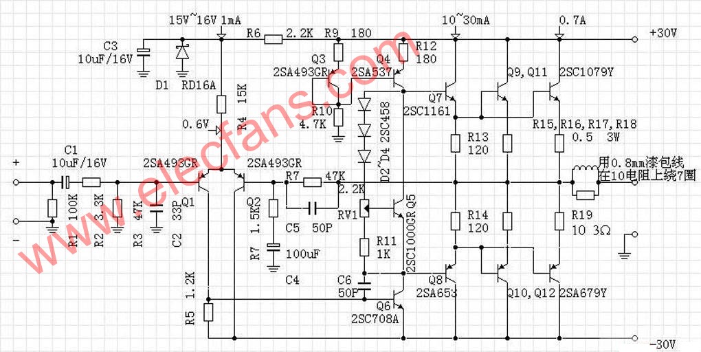 為5。這款家用音頻放大器可以使用+-30V對(duì)稱電源輸出32W。如果您想要立體聲功率放大器,請(qǐng)查看其他原理圖。