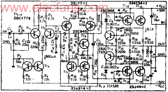 119 功率MOSFET管構(gòu)成的功率放大器電路圖