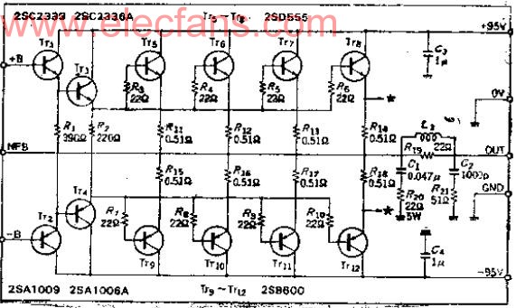 晶體管構(gòu)成的500W輸出功率放大器電路圖