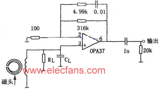 關(guān)鍵詞:OPA37 , 前置放大器 如圖所示為OPA37構(gòu)成的低噪聲前置放大器。輸入信號加在OPA37的同相輸入端(引腳3),電路中的RL、CL為電磁式拾音器的負(fù)載阻抗,其阻值和容量可依拾音器的特性