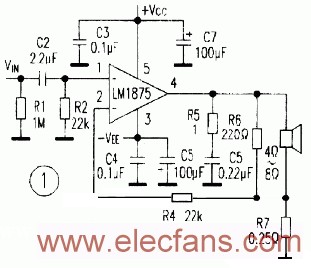 20 LM1875是一款高保真單聲道功放IC,其既可以單電源工作,亦可以采用雙電源工作,不少音響愛好者選用該IC來(lái)制作功放電路。LM1875的電路原理圖如下圖所示。