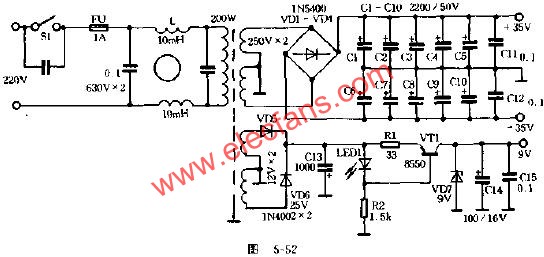 4、本機左聲采用反相放大可使兩只LM3886均衡地向正負(fù)電源縈取電流,電源電壓始終對稱,從而改善音質(zhì),使低音深沉有力,中音明亮,如圖5-54所示。