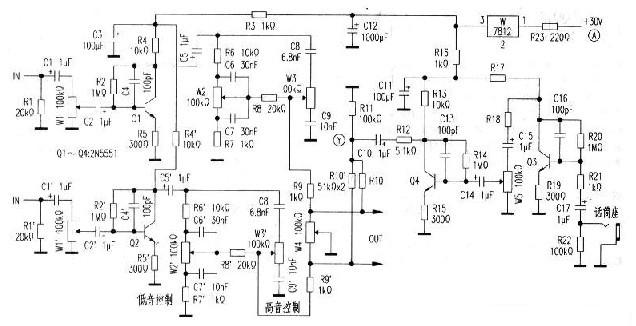 該電路一共用4只NPN型三極管2N5551,Q1、Q2分別放大左右聲道音頻信號,經(jīng)C5、C5‘進(jìn)入音調(diào)控制電路,W2、W2’是2×100kΩ雙連電位器??刂聘咭舻脑鰷p。