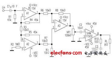 1063 本低音炮功放系統(tǒng)的設(shè)計(jì)采用了由NE5532構(gòu)成的低噪聲放大電路,前置電路信號(hào)放大電路、功率放大電路、波形變換電路、穩(wěn)壓電源等幾個(gè)模塊組成。
