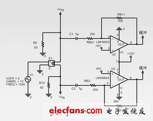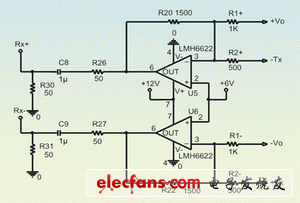 由于LMH6622的噪聲及失真率較低,因此可用作下行鏈路的低噪聲前置放大器。低噪聲及低失真率這兩個(gè)優(yōu)點(diǎn)可確保接收通路具有很高的動態(tài)范圍,以滿足 ADSL標(biāo)準(zhǔn)有關(guān)線性度及噪聲的嚴(yán)格規(guī)定。圖4的LMH6622芯片可以實(shí)現(xiàn)反相加法放大器的功能,以便提供接收前置放大器通道增益,并消除驅(qū)動器的回波信號。為了消除接收通道上的驅(qū)動器回波信號的干擾,R1+必須設(shè)定為2×R2+,而 R1-也必須設(shè)定為 2×R2-。實(shí)際應(yīng)用中,由于信號匹配并不理想,因此混合抑制約為12dB。在仿真時(shí)可以改變電阻值,以便測試出接收電路的真正性能。