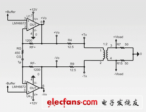 由于LMH6672芯片只需一個(gè)電源供電便可輸出極高的驅(qū)動電流,而且失真率低,因此可以用作上行DSL線路驅(qū)動器。LMH6672芯片用作差分輸出驅(qū)動器時(shí),可以驅(qū)動50Ω負(fù)載,達(dá)到 16.8Vpp的擺幅,失真率只有-93dBc,可支持最高的上行功率,確保ADSL線路支持最高的傳輸率。圖3是典型的線路驅(qū)動器電路圖,圖中的線路驅(qū)動器通過匝數(shù)比為1:2的變壓器,可驅(qū)動100Ω的雙絞線電纜。這個(gè)非反相驅(qū)動放大器的電壓增益由公式(1)或(2)確定。