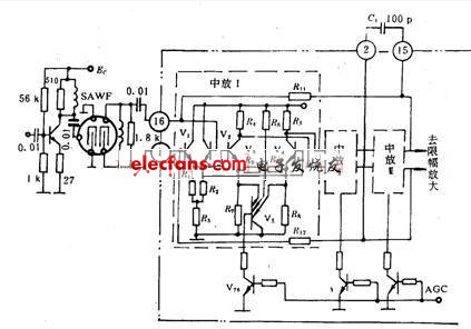 集成中放電路通常采用三級(jí)具有恒流源、直接耦合、寬通帶的差動(dòng)放大器。由于集成中放電路本身沒有諧振電路,因此采用聲面波濾波器,以獲得集成中頻放大器所需要的頻率特性。各集成中放電路結(jié)構(gòu)大致相同,現(xiàn)僅以TA7611AP為例簡(jiǎn)單介紹如下。結(jié)構(gòu)如圖7-10所示。